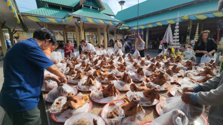 นางสาวนภัสกร แจ่มเจริญ เจ้าของร้านเสริมสวยและนวดแผนไทย เป็นเจ้าภาพ นำเจ้าหน้าที่ได้นำหัวหมูจำนวน 99 หัว วางเรียงรายเต็มลานกว้างด้านหน้าพื้นที่ทางขึ้นสักการะองค์หลวงพ่อสมหวัง ซึ่งได้จุดธูปบอกกล่าวเทพเทวดา บอกกล่าวองค์หลวงพ่อสมหวัง เพื่อให้การแก้บนครั้งนี้สำเร็จเสร็จสิ้น